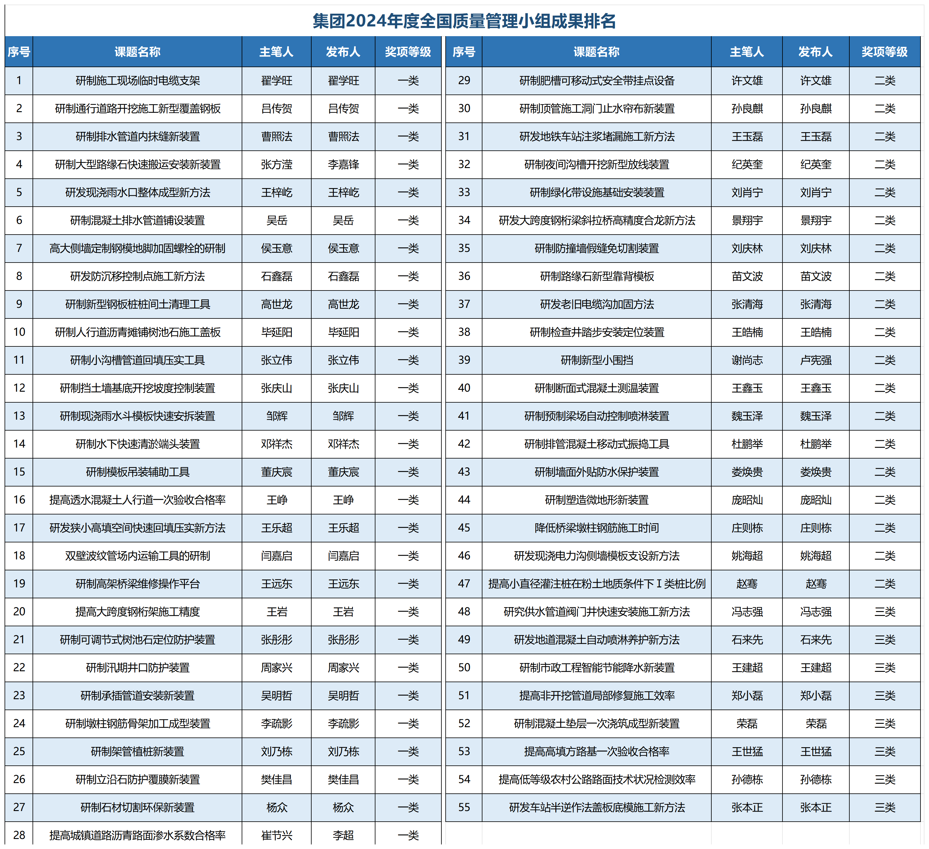 在本次市政工程建设质量管理活动中,城建集团公司发布QC成果55项,其中,一类成果28项、二类成果19项、三类成果8项;发布质量信得过班组成果14项,其中,示范级班组8项、专业级班组5项、推进级班组1项。