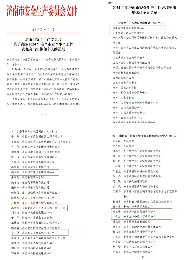 近日,济南市安全生产委员会印发《关于表扬2024年度全市安全生产工作表现突出集体和个人的通报》,伟德国际1949及集团所属山东金曰交通发展集团被评为安全生产工作表现突出集体,3名同志被评为安全生产工作表现突出个人,2名同志被评为“审计式”监督检查服务工作表现突出个人。