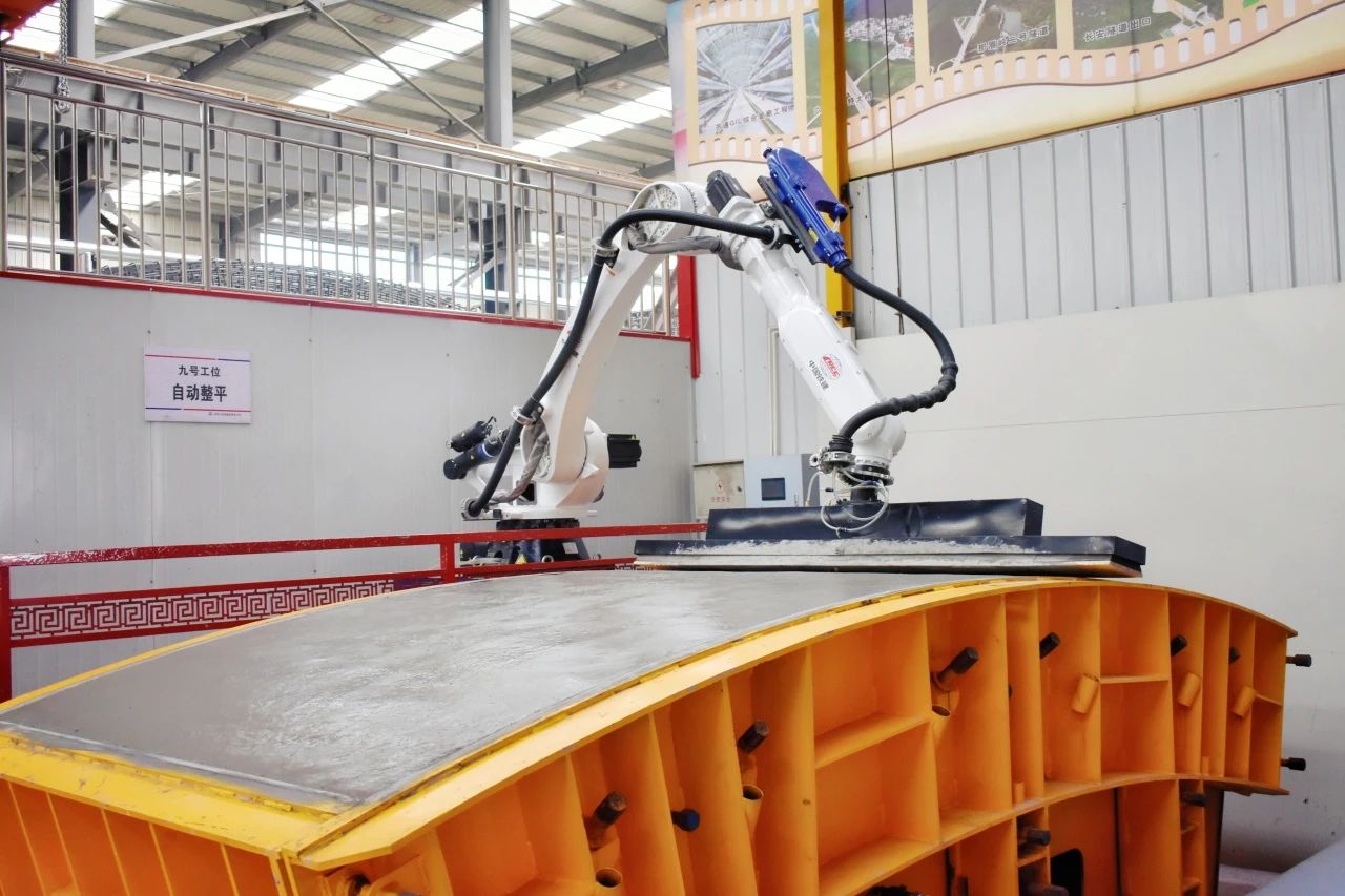 项目使用第五代超大直径盾构管片绿色智能生产线,设置1条灌注线、3条养护线,实现了20余项关键技术革新,搭载清模、喷涂、收面、运载、管片扫描、钢筋笼扫描等6种智能机器人,实现生产自动化、少人化,不仅减少了人工操作误差,降低了安全风险,而且提高了作业效率,节约了生产成本。3套管片模型实现每天7环的产能,每日发运数量最高可达11环,其中发明螺旋筋固定装置,投入使用后将合格率提升到99%;发明管片内、外弧面钢板定位装置,实施后预埋钢板一次成型合格率提升16.6%,有效提高生产效率,减少材料浪费。