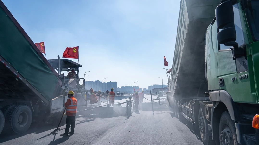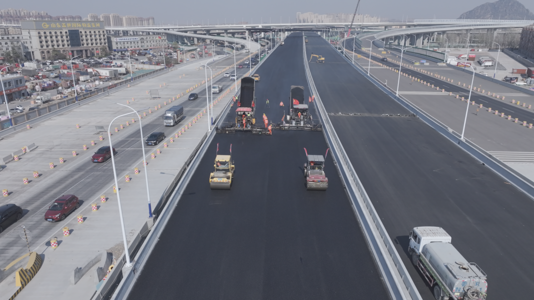 为高效、优质完成此次摊铺作业,项目部精心组织、科学安排,反复梳理施工计划,通过“温度窗口期”精准施工策略,在低温时段完成桥面铣刨等前期工序,气温回升至施工标准后立即启动摊铺作业,目前摊铺施工有序进行中。