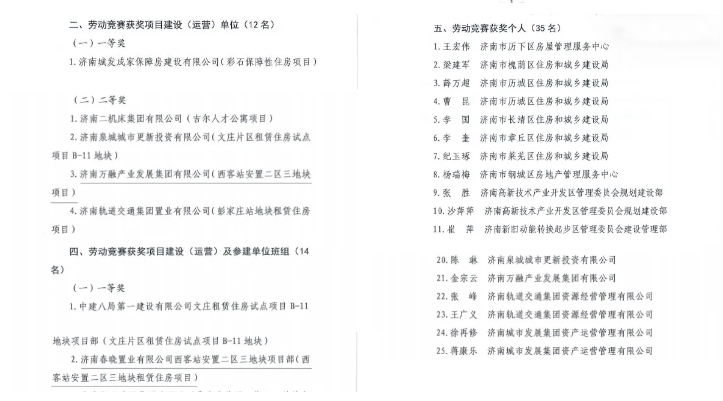 近日,济南市住建局、市总工会公布2024年保障房建功立业创新创优劳动竞赛结果的通知,伟德国际1949所属济南万融产业发展集团有限公司荣获项目建设(运营)单位二等奖、公司职工金宗云获评先进个人,万融集团所属济南春晓置业有限公司西客站安置二区三地块项目部荣获项目建设(运营)及参建单位班组一等奖。