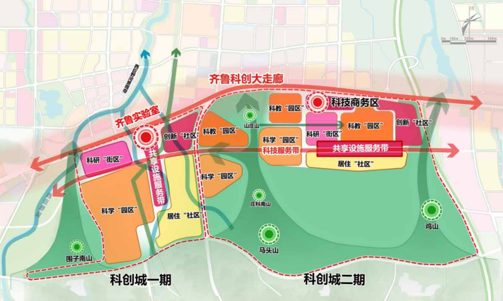 中科院科创城位于济南市规划的齐鲁科创大走廊,是未来产业创新圈的重要组成部分,与产研院创新圈、超算中心创新圈、山东大学创新圈共同构建“基础创新+技术创新+转化应用”的创新生态链。其中,一期重点布局重大科技基础设施、前沿交叉研究平台及国家级、省级实验室;二期则突出科技赋能转化,加强与大院大所合作,建设新型研发机构和科创载体,助力济南创建“综合性国家科学中心”核心承载区。项目秉持“开放集聚、融合共享”的理念,统筹科研、生活和生态空间,形成“科创引领、组团共融、生态共享”的总体结构,通过科学合理的功能分区和创新生态链的构建,为济南市的科技创新和产业升级提供强大支撑,成为推动区域高质量发展的新引擎。