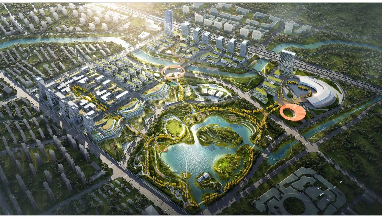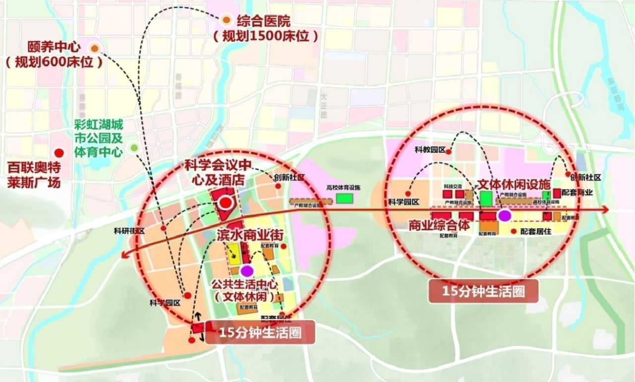 本区域配套设施完善,统筹共享城市级医疗、文体及商业设施。以科创城为中心,两公里范围内规划建设有1500床位的综合医院、600床位的颐养中心、占地40公顷的彩虹湖城市公园以及建筑面积10万平方米的奥特莱斯商业综合体等。科创城内部结合景观水系,规划建设共享服务带,集中设置众创平台、文体活动中心、餐饮商业、社区医院等,并同步规划建设可容纳2000人的会议中心和1000客房的国际酒店。